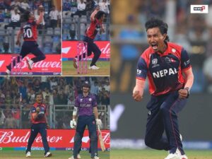 nep vs sco sompal kami take nimble catch off his own bowling: नेपाल के तेज गेंदबाज सोमपाल कामी ने अपनी ही गेंद पर एक बेहतरीन कैच लपका.