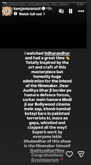 कंगना रनौत ने अपनी इंस्टा स्टोरी पर फिल्म एक क्लिप शेयर की और डायरेक्टर आदित्य धर की जमकर तारीफ की है. उन्होंने ‘धुरंधर’ को मास्टरपीस बताया है. कंगना ने पोस्ट में लिखा, “मैंने धुरंधर देखी और फिल्म को देखते हुए बहुत मजा आया, लेकिन ये साधारण फिल्म नहीं, मास्टरपीस है. फिल्ममेकर्स को बहुत सारी रिस्पेक्ट है.”