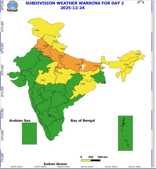 दिल्ली-NCR और उत्तर भारत के ज़्यादातर हिस्सों में मंगलवार और पूरे हफ़्ते ठंड का एहसास होने वाला है. मौसम विभाग (IMD) ने तेज ठंड और कोहरे का अनुमान लगाया है. IMD ने 27 दिसंबर तक भारत के कई हिस्सों में घना कोहरा रहने का अनुमान लगाया है, जिससे रात और सुबह के समय विज़िबिलिटी में दिक्कत हो सकती है. बुधवार को दिल्ली में कम से कम 10 डिग्री सेल्सियस तापमान रहने की उम्मीद है, जबकि पड़ोसी गुरुग्राम और नोएडा में कम से कम 8 डिग्री सेल्सियस और 12 डिग्री सेल्सियस तापमान रहने का अनुमान है.
