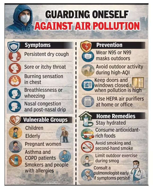 Associate consultant, respiratory and sleep medicine at Medanta Hospital, Dr Abhishek Tandon, said sulphur dioxide, nitrogen dioxide and ozone—largely released from vehicles—irritate airways and cause flu-like symptoms even in healthy people. They make lining of airway sensitive, leading to nasal discharge that flows into the throat, causing irritation and dry cough. As symptoms resemble flu but occur without fever, many people delay treatment.He said preventing exposure was critical. “Even patients on regular medication must wear N95 masks while stepping outdoors. Exposure to polluted air without protection can quickly reverse recovery,” he said.People with asthma and COPD are at higher risk. Prof Ajay Kumar Verma, head of respiratory medicine at RMLIMS, said many asthma patients feel better after treatment but fell ill again once they returned to polluted surroundings. “Wearing masks, as during Covid-19 period, especially in morning and evening, can help avoid such symptoms,” he said.Consultant at Apollo Medics Hospital, Dr Shubham Agarwal, said fine particles like PM2.5 and PM10 settle deep in lungs, causing long-term damage and triggering severe asthma attacks even among young people.Dr Rajneesh Kumar Srivastava of Max Super Speciality Hospital said said children and elderly were at high risk of developing asthma or COPD due to rising pollution levels. “Children’s lungs are developing, they breathe faster and spend more time outdoors, increasing exposure to harmful substances like PM2.5, SO₂, and NO₂.In older adults, weaker lungs and reduced immunity make conditions like COPD and asthma worsen more easily,” he explained. He added people with existing lung diseases were especially vulnerable.Doctors warned that long-term exposure to polluted air can lead to serious diseases, including asthma, COPD, lung disease, and heart problems.
