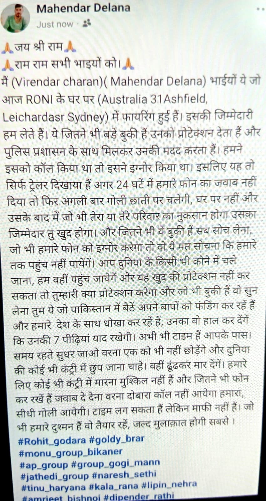 इस वायरल पोस्ट के बाद सवाल उठने लगे हैं कि क्या वाकई लॉरेंस बिश्नोई–रोहित गोदारा गैंग का नेटवर्क अब ऑस्ट्रेलिया तक सक्रिय हो चुका है? या फिर यह सोशल मीडिया के जरिए डर फैलाने और ताकत दिखाने की एक और कोशिश है?