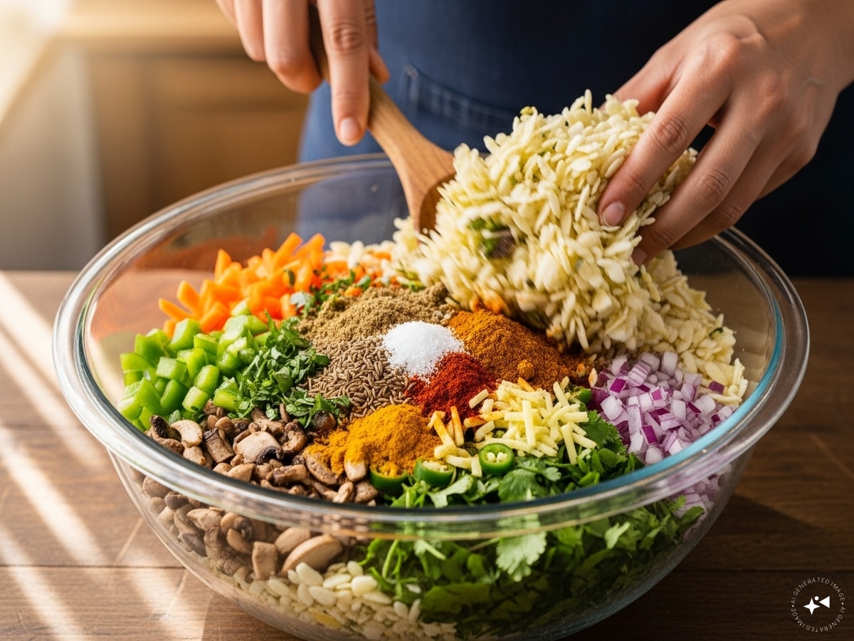अब उसी बाउल में भीगा हुआ पोहा डाल दें. इसके बाद अपनी पसंद की बारीक कटी सब्जियां डालें, जैसे गाजर, शिमला मिर्च, प्याज, मशरूम, हरा धनिया, हरी मिर्च और थोड़ा अदरक. आधा चम्मच अजवाइन को हाथ से मसलकर डालें. फिर भुना जीरा पाउडर, धनिया पाउडर, चाट मसाला और एक चुटकी हल्दी डालें. स्वाद के हिसाब से नमक और थोड़ी लाल मिर्च मिलाकर सब चीजों को अच्छे से मिक्स कर लें.