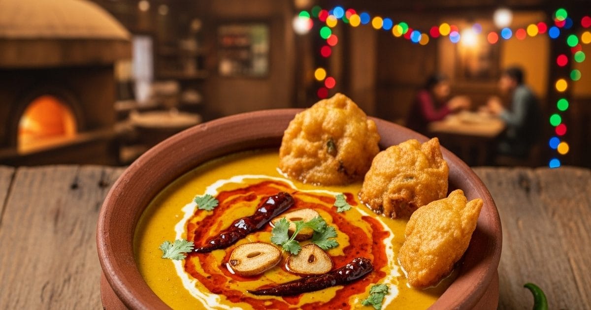 ढाबा‑स्टाइल कढ़ी का राज है, गाढ़ा दही‑बेसन बेस, तगड़ा लहसुन‑वाला तड़का और धीमी आंच पर पकाना.