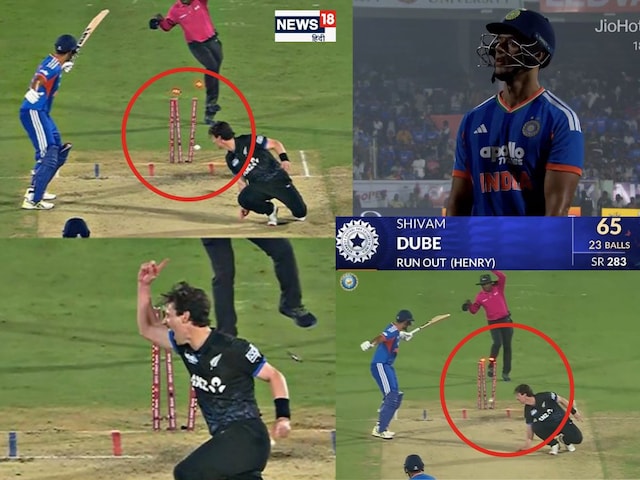 दरअसल, 28 जनवरी की रात भारत-न्यूजीलैंड के बीच पांच मैच की टी-20 सीरीज का चौथा मुकाबला खेला गया. शुरुआती तीन मैच गंवाकर पहले ही सीरीज हार बैठी कीवी टीम ने टॉस गंवाकर पहले बल्लेबाजी करते हुए भारत के सामने 216 रन का मुश्किल लक्ष्य रखा. जवाब में भारतीय बैटिंग ऑर्डर लड़खड़ा गया. 10.3 ओवर में सिर्फ 82 रन पर पांच विकेट गिर चुके थे. ऐसे नाजुक वक्त में शिवम दुबे ने एक मोर्चा संभाला और 15 गेंद में अर्धशतक जमाते हुए स्कोर 145/5 तक पहुंचा दिया. मगर तभी हर्षित राणा के शॉट पर बॉलर मैट हैनरी का हाथ लगा और गेंद नॉन स्ट्राइक एंड पर जा लगी. शिवम दुबे क्रीज से बाहर थे तो वह रन आउट करार दे दिए गए. क्रिकेट में ऐसे मौके कम ही आते हैं जब कोई बल्लेबाज इतनी बदकिस्मती से रन आउट होता हो.