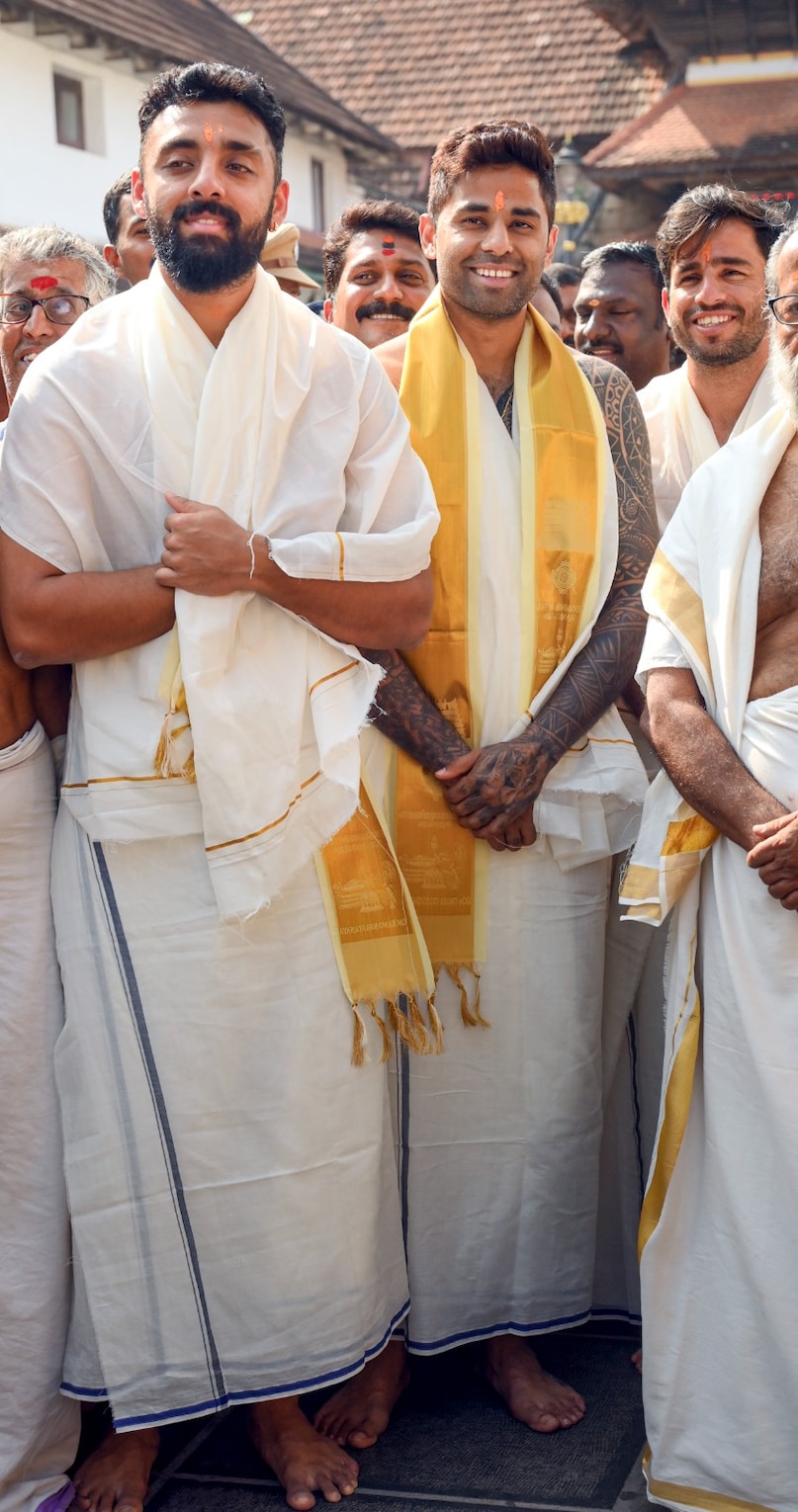 भारतीय क्रिकेट टीम ने न्यूजीलैंड के खिलाफ पांचवें और आखिरी टी-20 से पहले श्री पद्मनाभस्वामी भगवान का आशीर्वाद लिया. केरल के पारंपरिक कपड़े मुंडू और मेलमुंडू पहने कैप्टन सूर्यकुमार यादव, अक्षर पटेल और रिंकू सिंह को धार्मिक स्टाइल देखते ही बनता था.